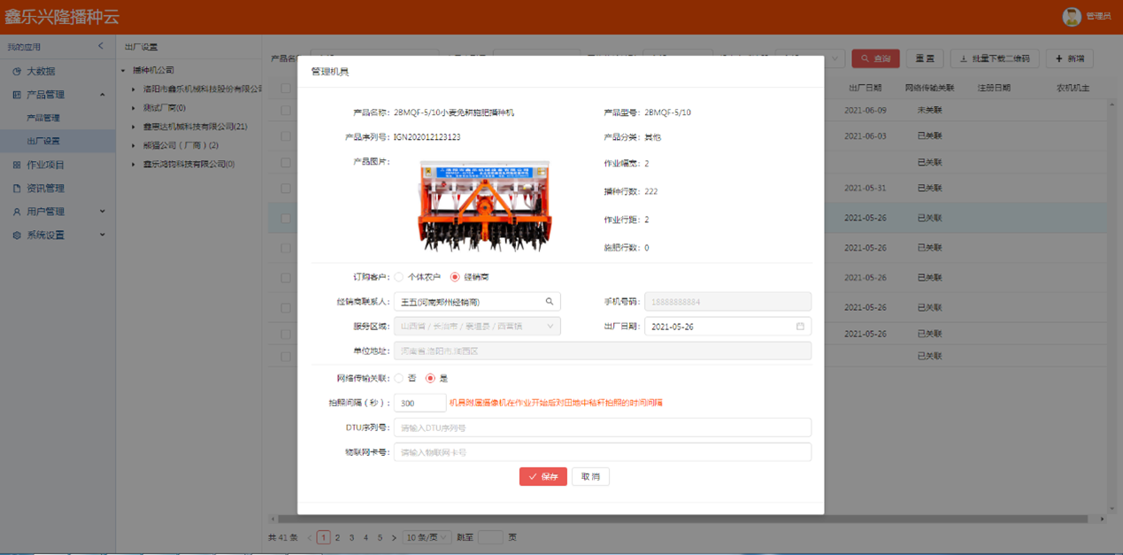 - 大數據中心:為播種機(農機)生產廠家、播種機(農機)經銷商、其他農資(機)經銷商提供農機作業(yè)相關的數據統(tǒng)計及展示功能。