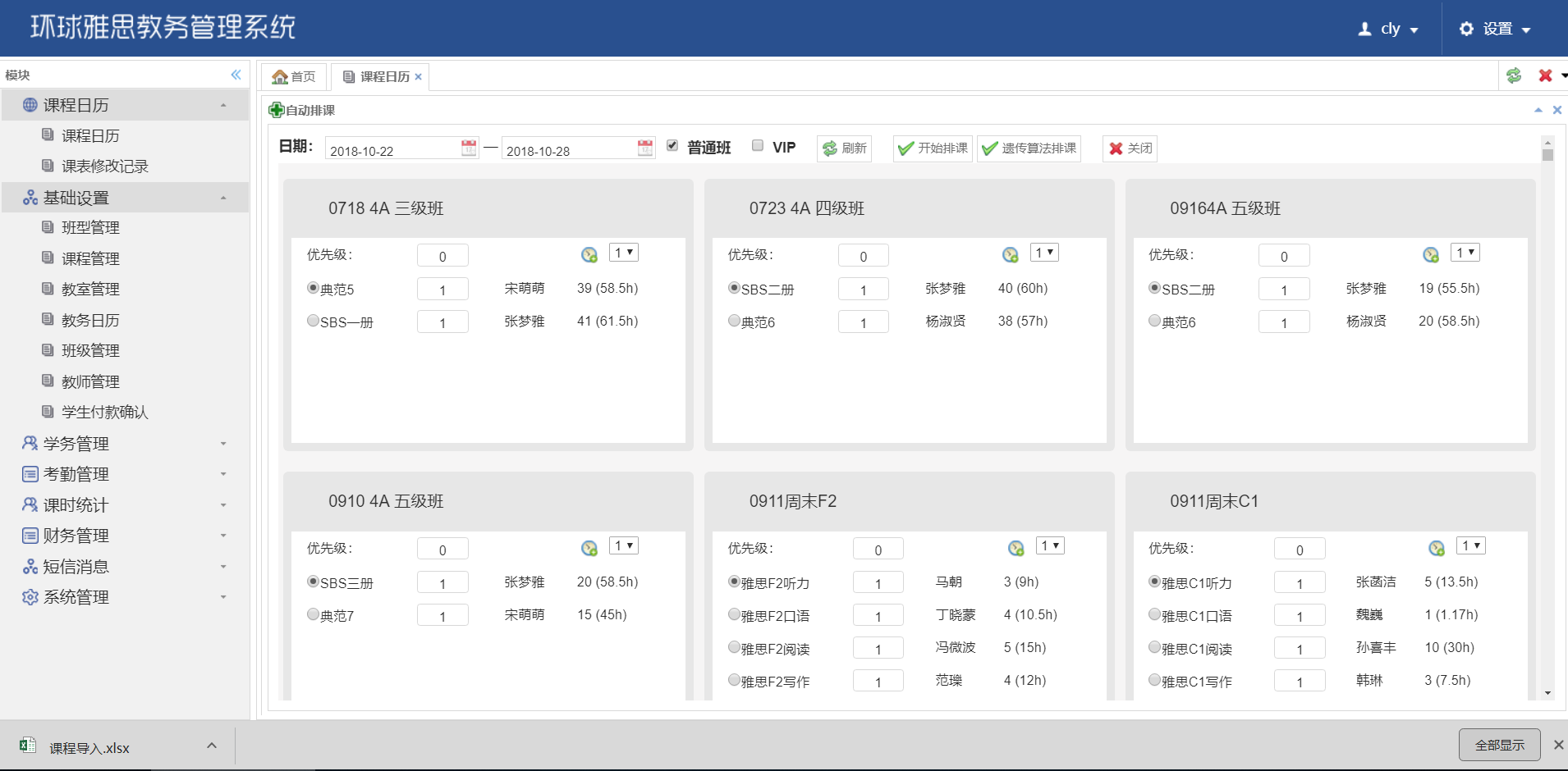 • 智能排課:基于遺傳算法進(jìn)行演化式智能排課,綜合教務(wù)日歷、課程設(shè)置、班級(jí)、教室、教師等因素自動(dòng)尋找最優(yōu)化解決方案;