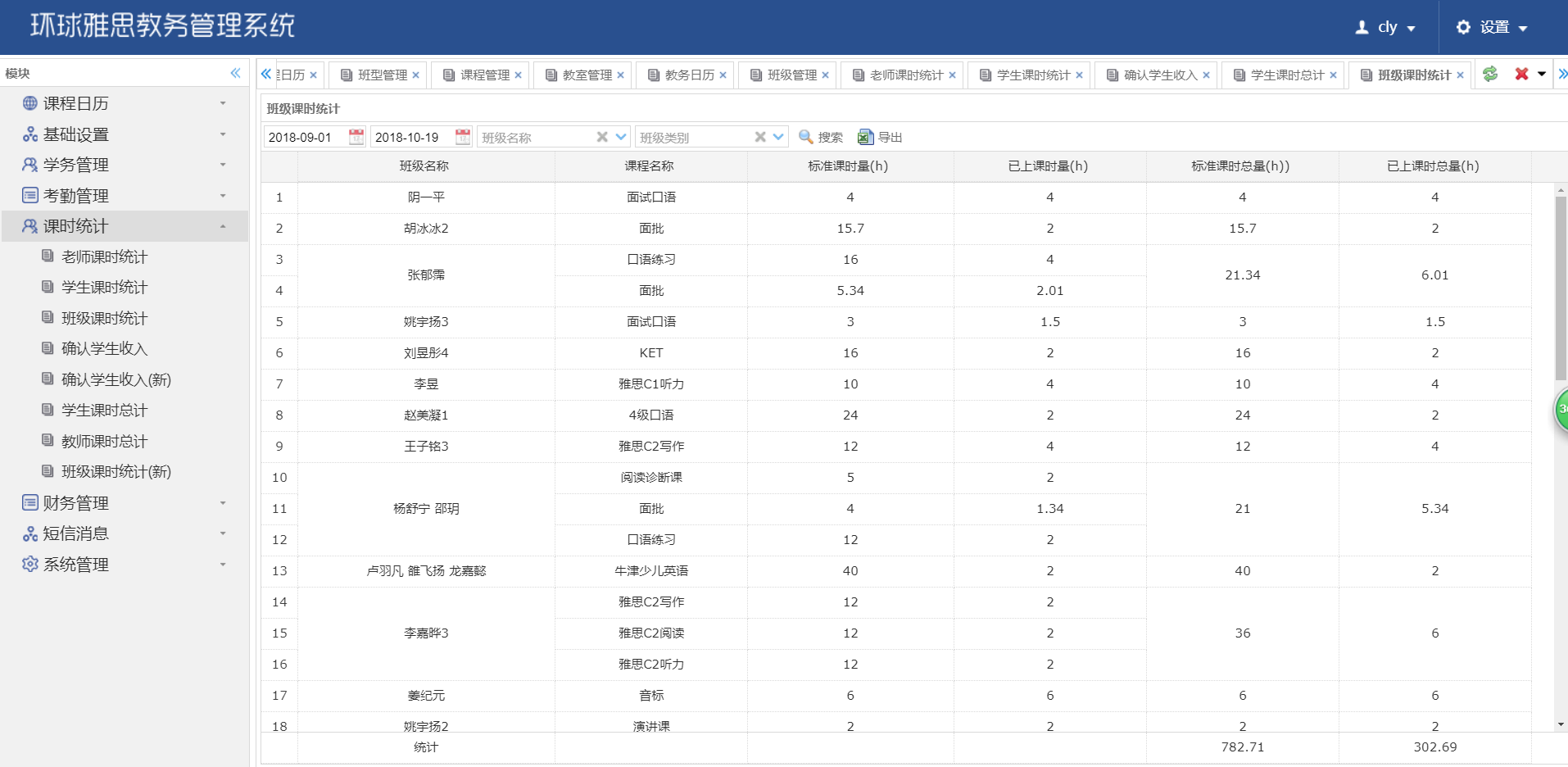 • 課時(shí)統(tǒng)計(jì):老師課時(shí)統(tǒng)計(jì)、學(xué)生課時(shí)統(tǒng)計(jì)、班級(jí)課時(shí)統(tǒng)計(jì)