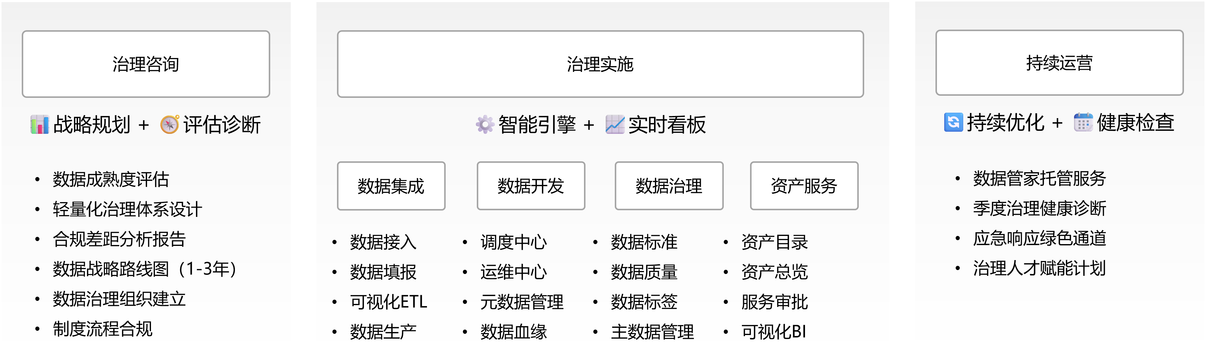 數(shù)據(jù)治理服務(wù)流程圖“樞理”從戰(zhàn)略高度出發(fā),開展數(shù)據(jù)治理咨詢。通過(guò)數(shù)據(jù)成熟度評(píng)估,精準(zhǔn)診斷企業(yè)數(shù)據(jù)管理現(xiàn)狀;設(shè)計(jì)輕量化治理體系,適配企業(yè)規(guī)模與業(yè)務(wù)特性;出具合規(guī)差距分析報(bào)告,保障數(shù)據(jù)管理符合行業(yè)規(guī)范。同時(shí),繪制1 - 3年數(shù)據(jù)戰(zhàn)略路線圖,明確長(zhǎng)期治理方向;協(xié)助建立數(shù)據(jù)治理組織,厘清職責(zé)分工;規(guī)范制度流程,讓數(shù)據(jù)治理“有章可循”,為后續(xù)治理筑牢頂層設(shè)計(jì)基礎(chǔ) 。